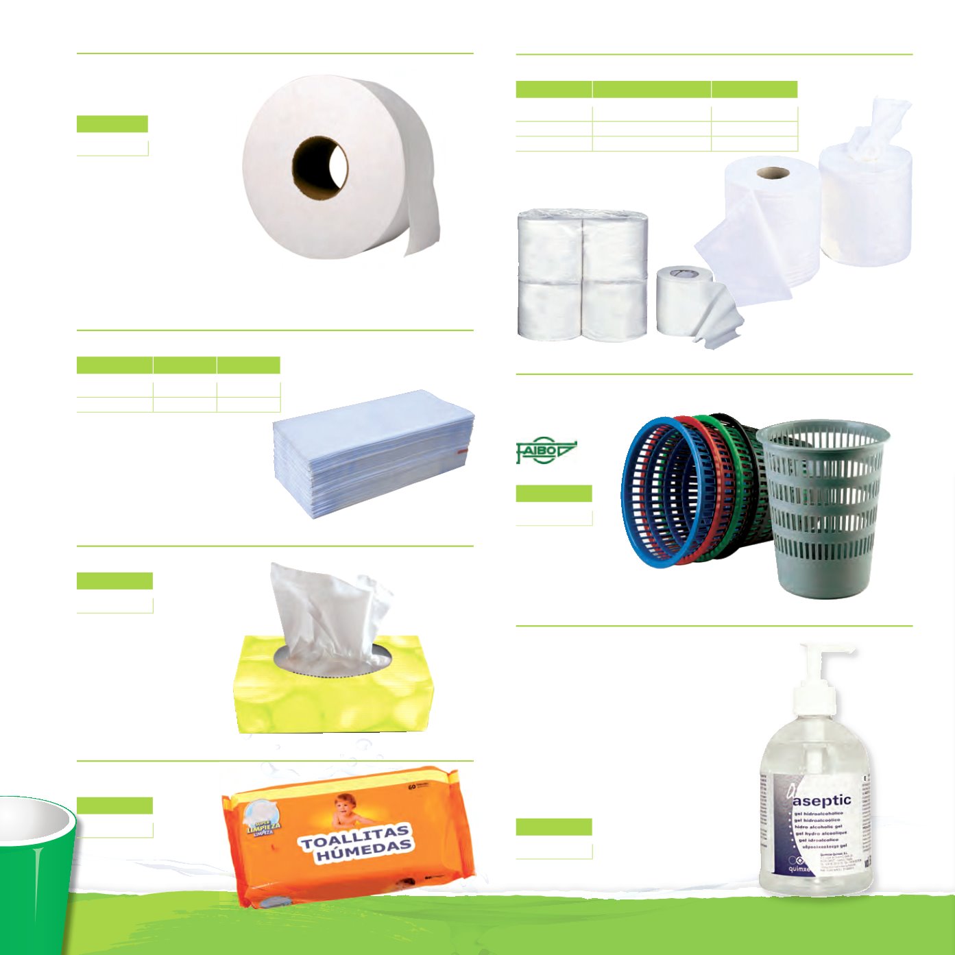 pañuelos, papel higiénico, secamanos, toallitas y papeleras
